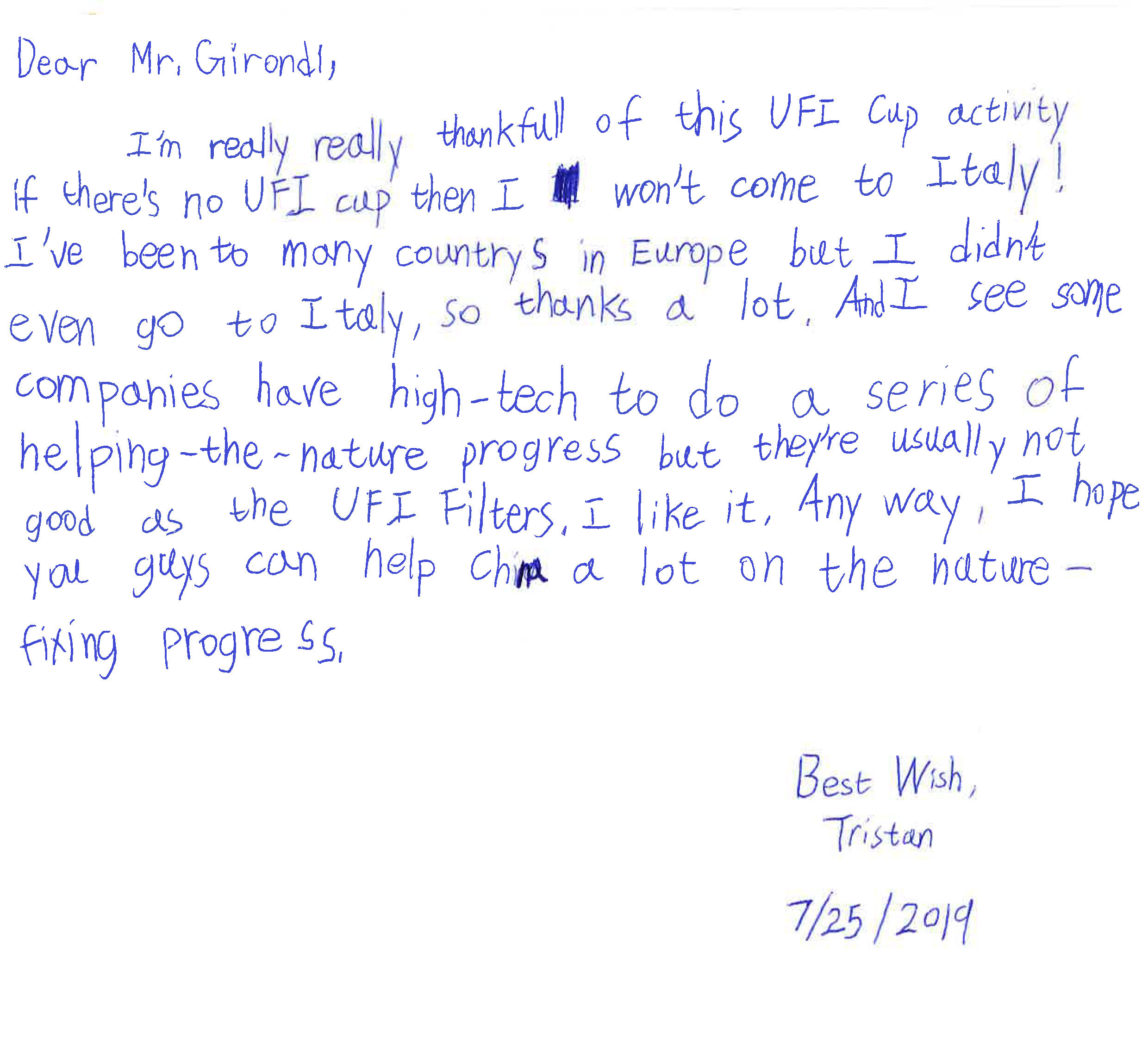 The youngster was given a warm welcome at the UFI Filters head offices in Italy, together with his family, to learn more about the company and its sustainability projects.